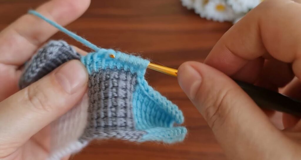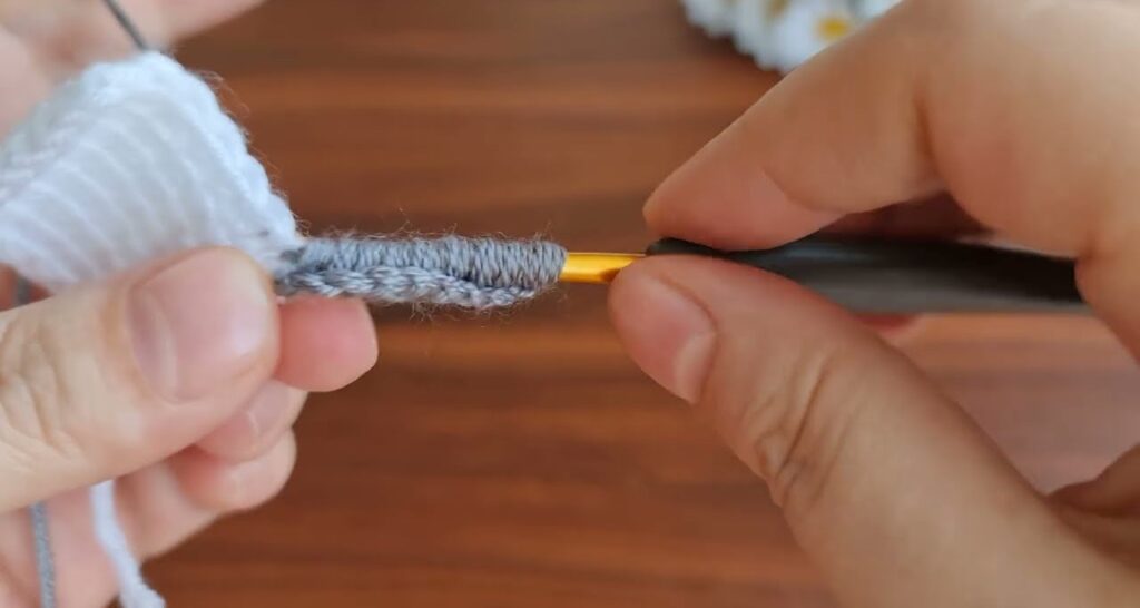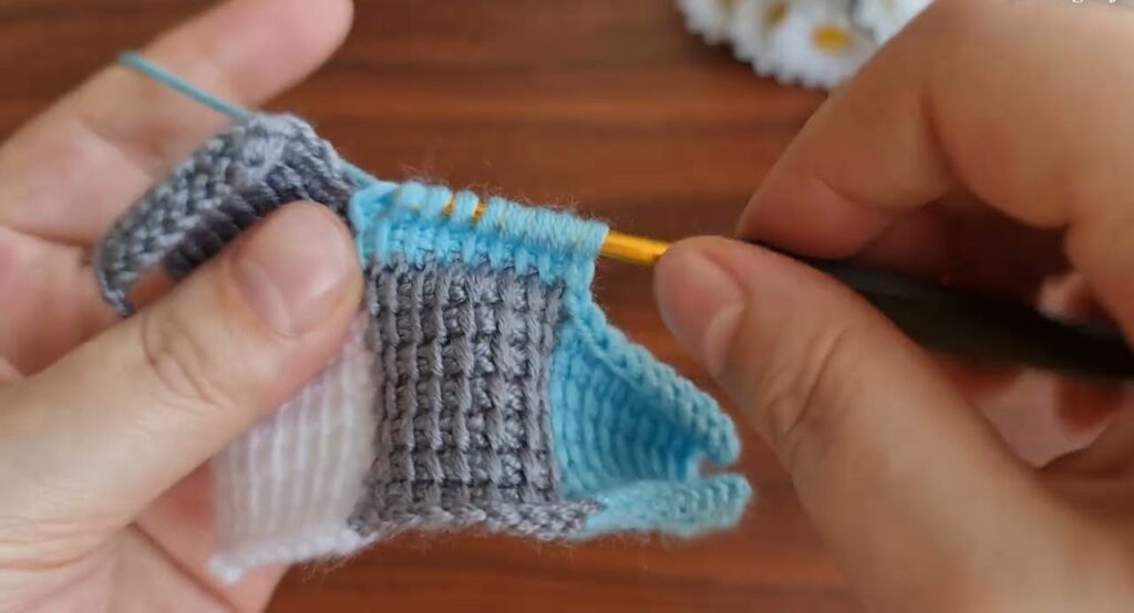 - Next row: Pick up loops from 3 chains (total 3 loops on hook), work return pass.