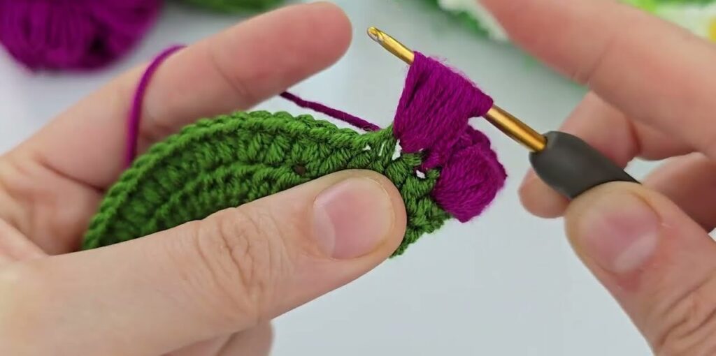 - Pull up purple yarn and ch 1 to secure.
