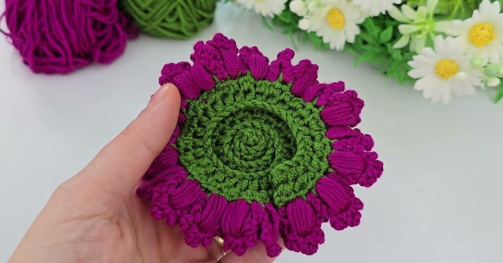 Here is a clear, step-by-step tutorial for making the beautiful 3D puff-flower crochet motif shown in the image.