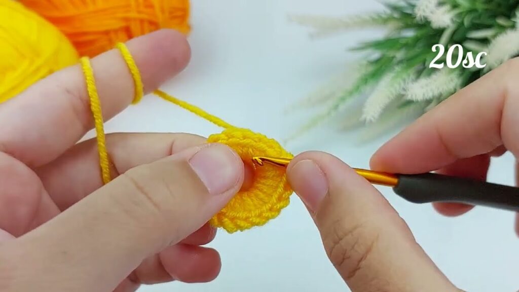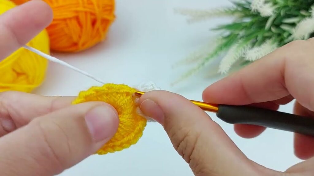 - Join the white yarn in any dc stitch from the yellow round with a sl st.