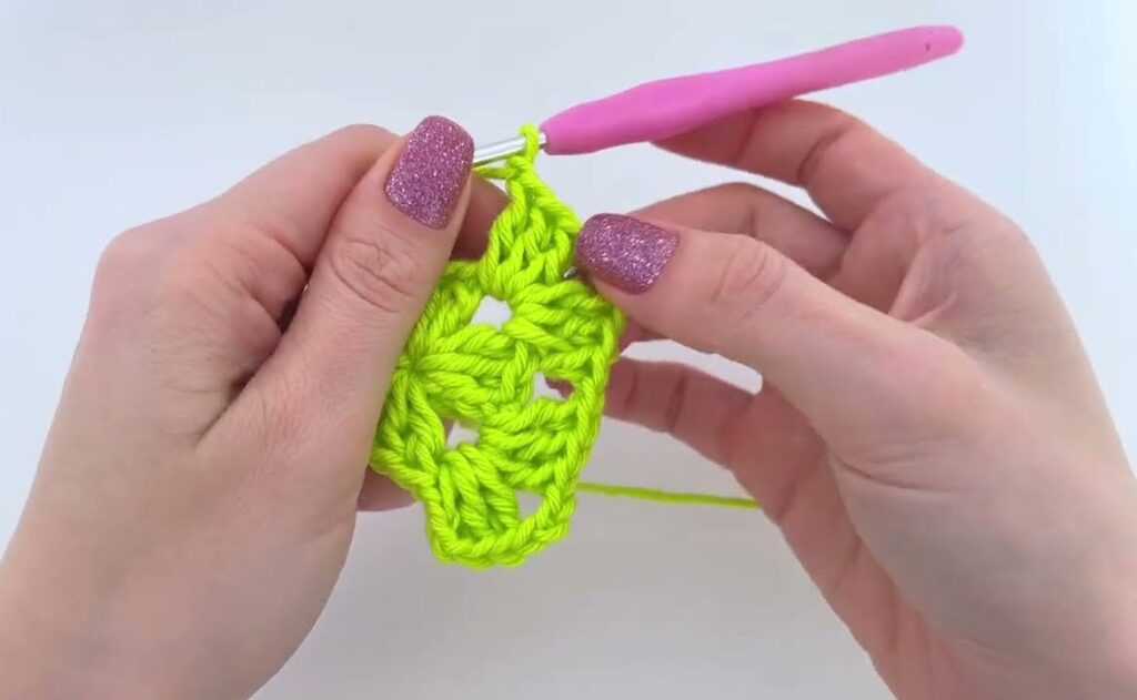 6. In next gap: (3 dc, ch 2, 3 dc) β†’ this forms second corner.