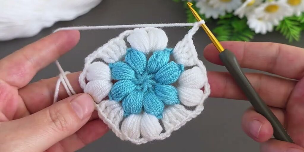 - Repeat the same puff + ch2 6 times total (6 petals).