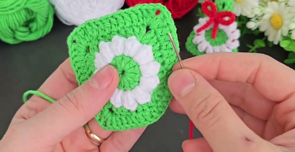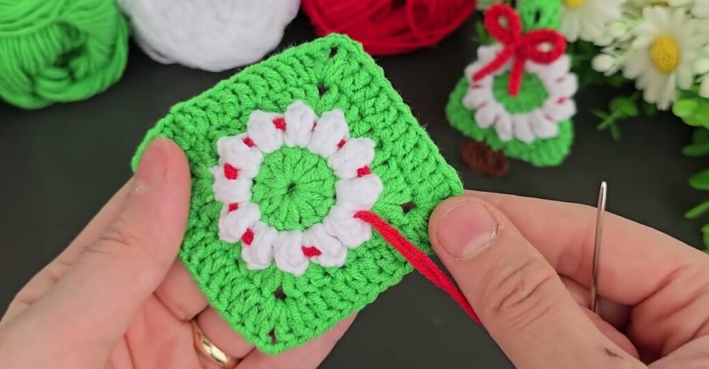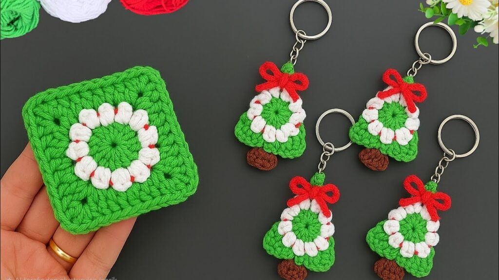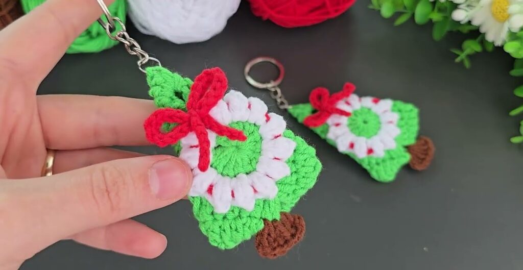 That’s a lovely crochet Christmas tree keychain made from a granny square wreath base! 🎄✨