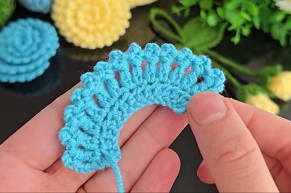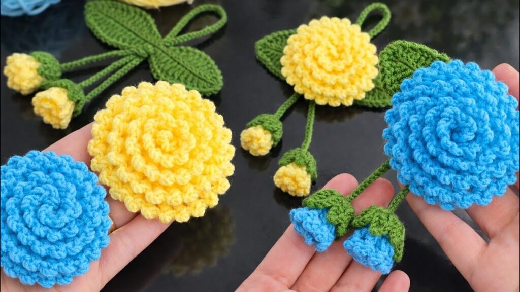 This is a crochet layered puff / spiral flower with stem, leaves, and buds. I’ll explain it step by step, easy to follow and adjustable in size.