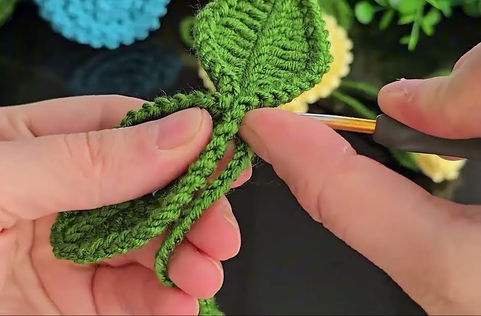- Attach green yarn at back center of flower