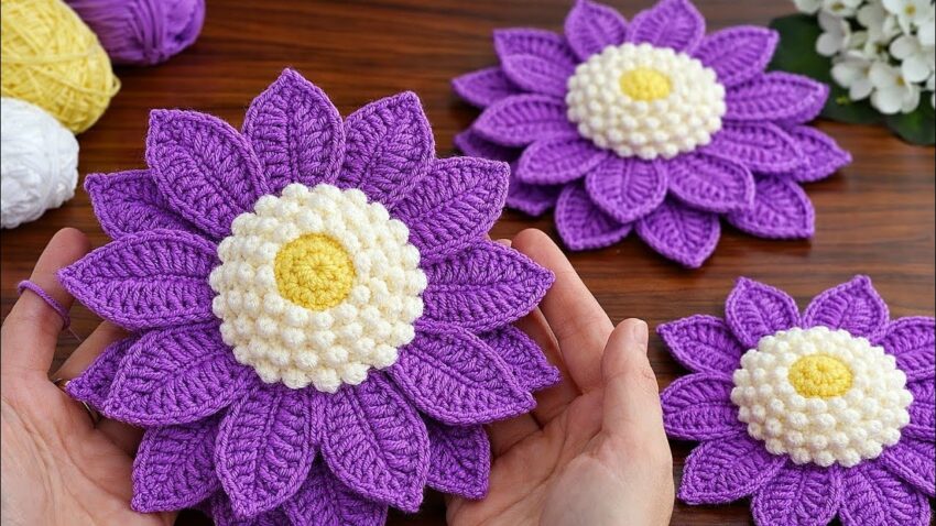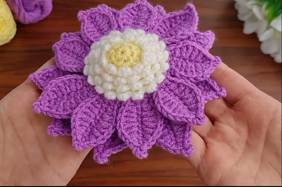 Lovely piece 🌸 This is a 3D layered crochet flower with a popcorn/bobble center and textured pointed petals. I’ll explain it step by step, beginner-friendly but detailed.