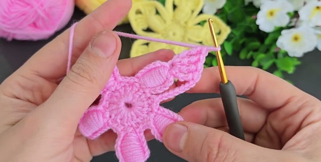 - Repeat chain 6 → slip stitch behind next petal around the circle.