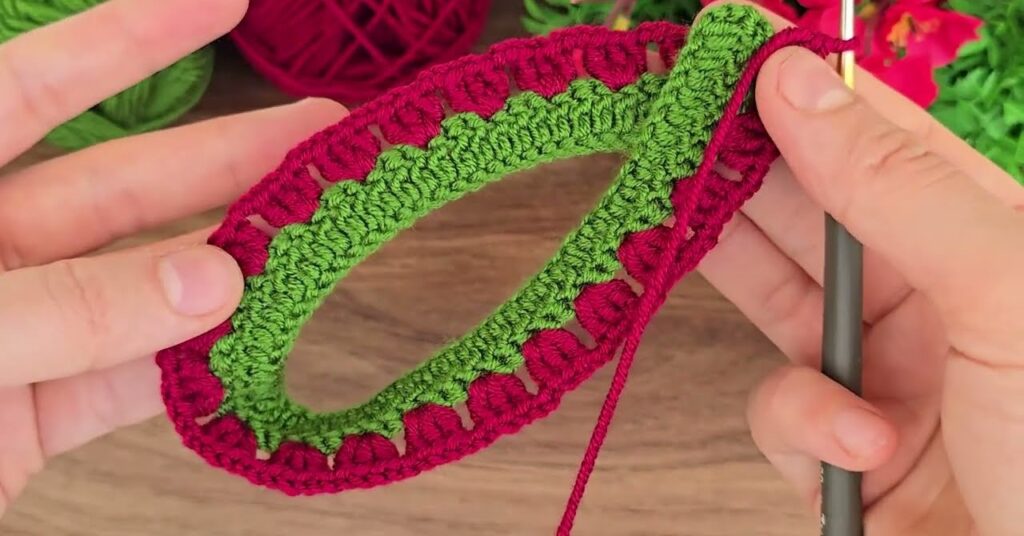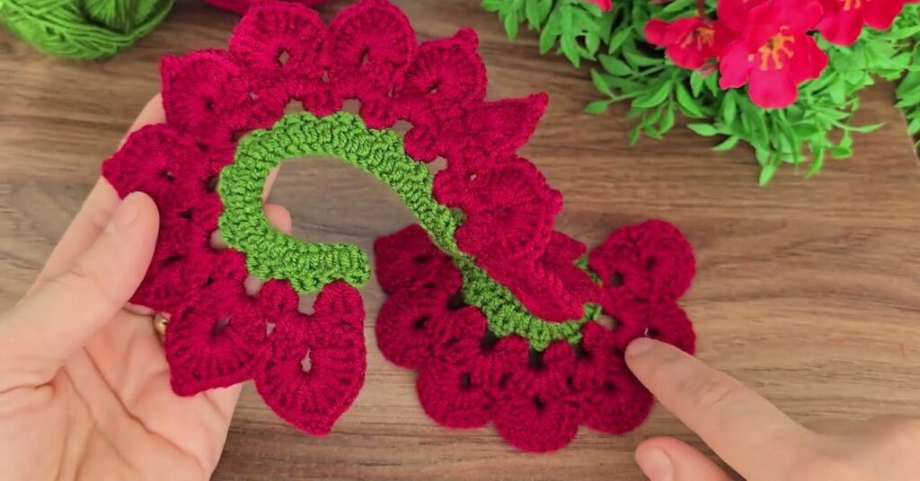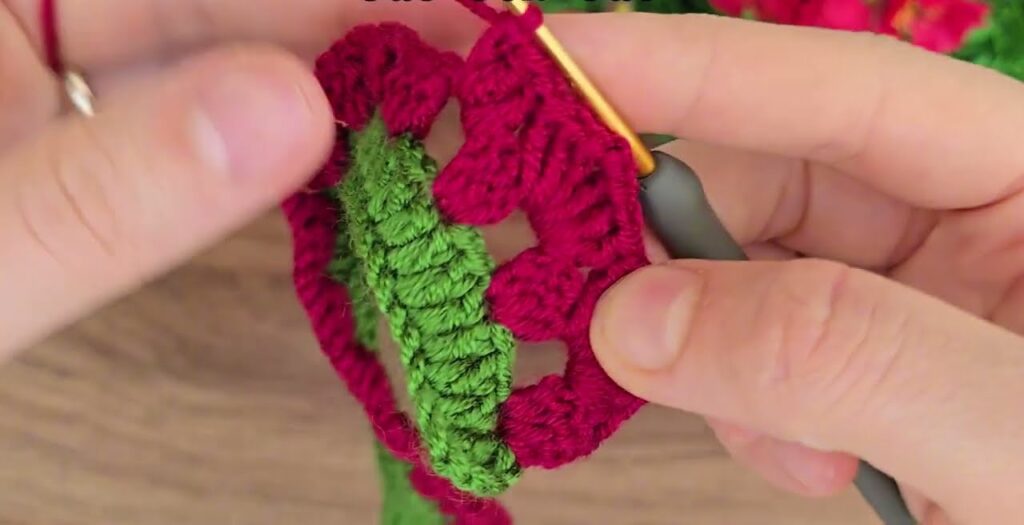 Now we’ll crochet red petals along one edge of the green spiral.