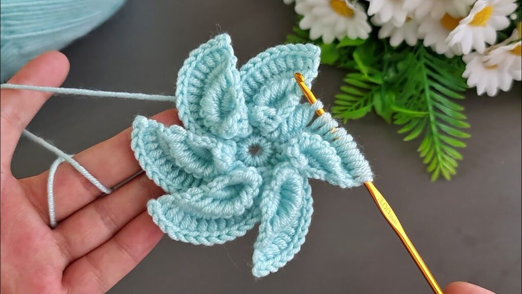 The image shows a crocheted 3D flower motif — it’s a layered flower pattern made using a 2.90 mm crochet hook and light blue yarn. Here’s a step-by-step guide to make one similar to it: