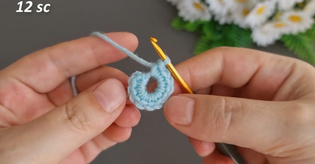 - Work 10 single crochets (sc) into the ring.