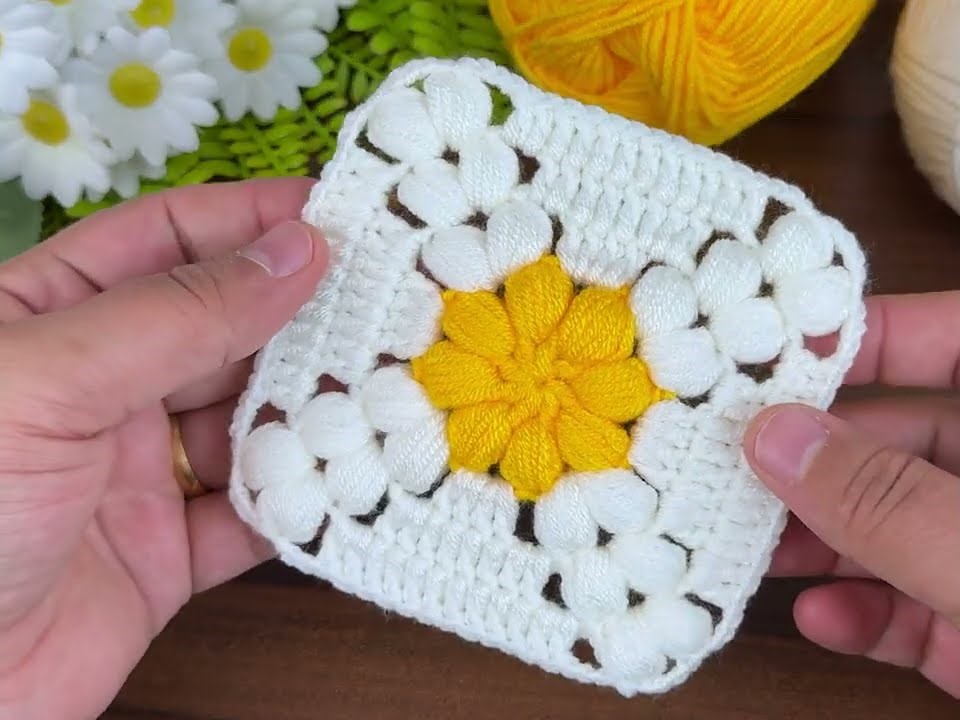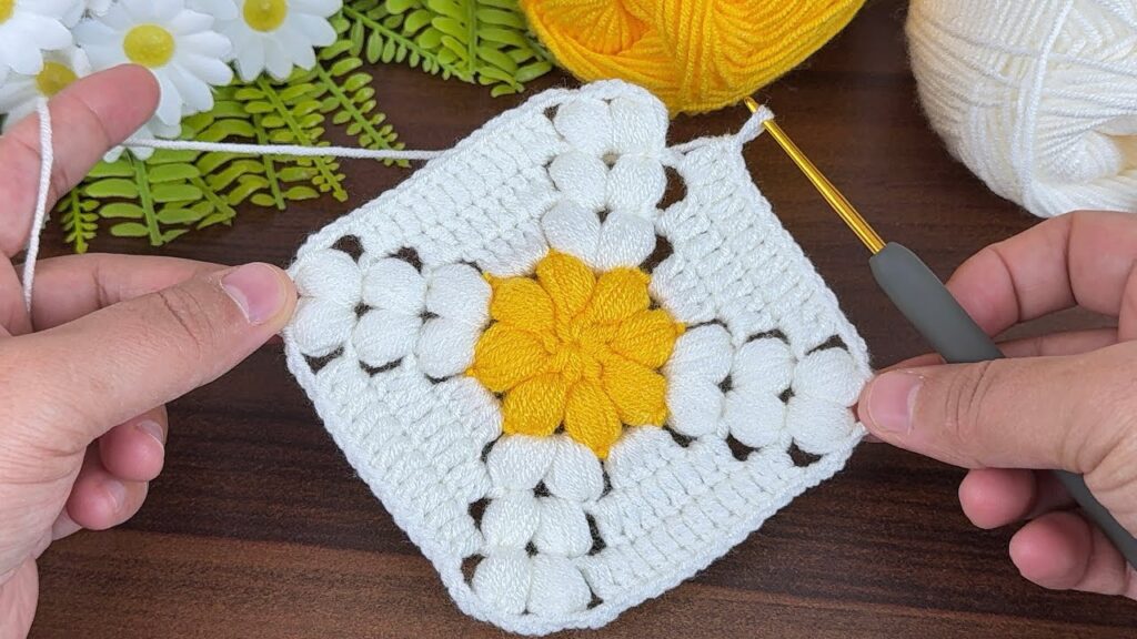 That’s a crochet flower granny square — it combines a puff stitch flower center with a classic granny square border. Here’s how to make it step-by-step 🌼