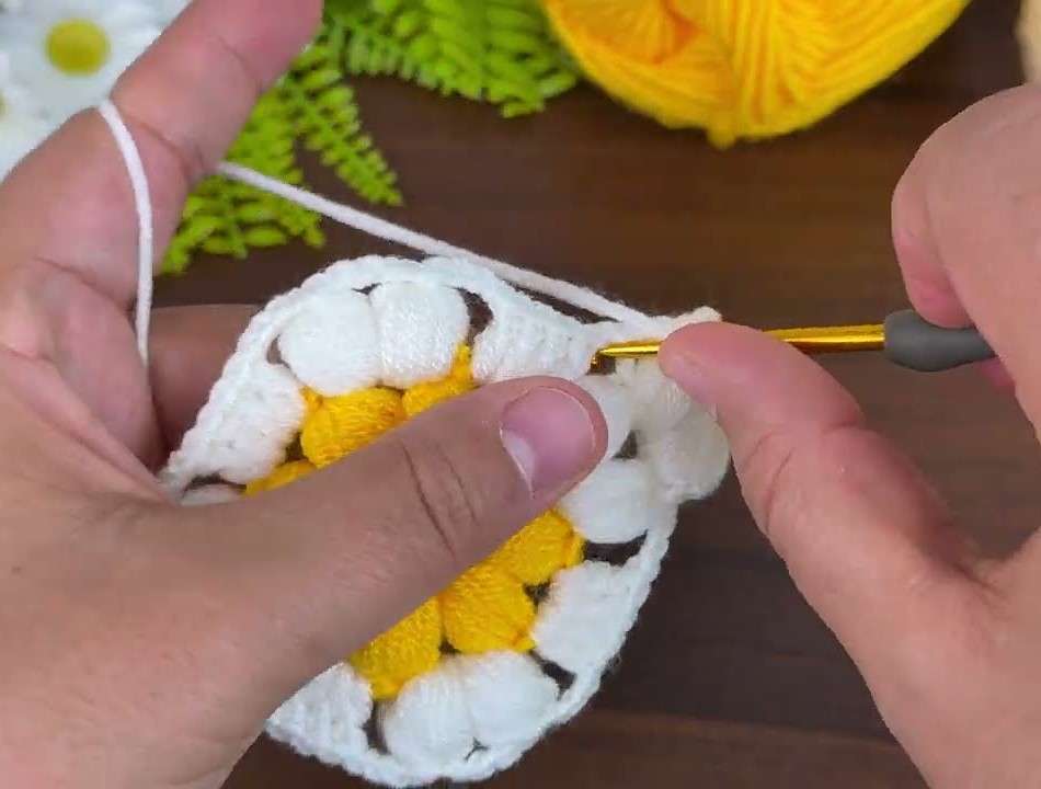 - Attach white yarn in any chain-1 space between two yellow puff stitches.