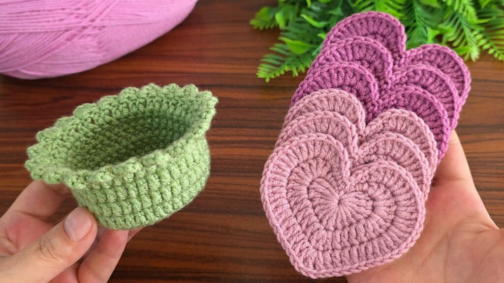 This picture shows crocheted heart coasters and a small crochet bowl (made from the same stitch, just continued upward). Hereβs how to make both, step by step π§Άπ
