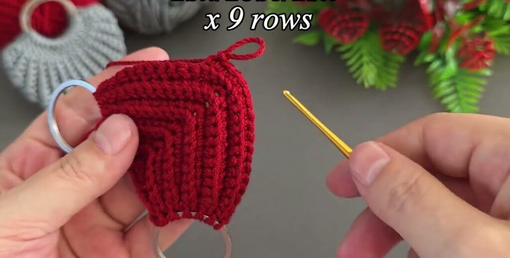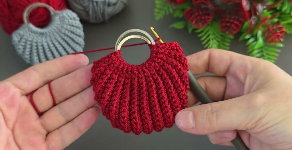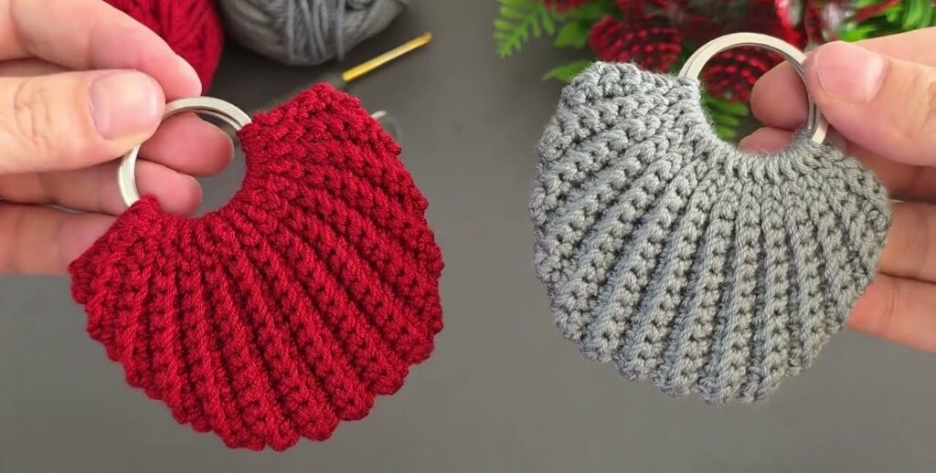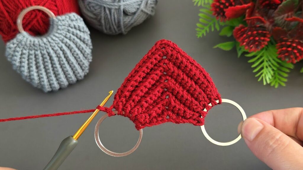 Great! I can show you how to make this. This is a crochet bag/leaf keychain holder made using two metal rings and single crochet worked in a V shape with increases in the center.