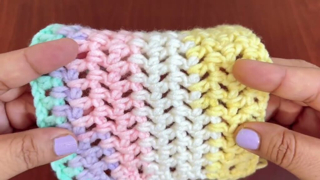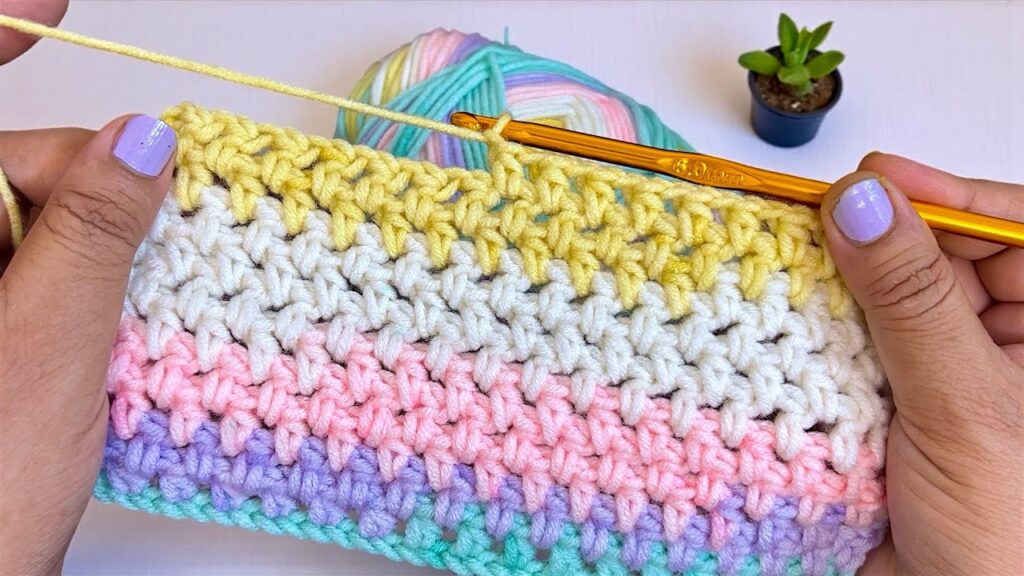 It looks like you uploaded a photo of a colorful crochet piece made with a 5.0 mm crochet hook and ombre (gradient) yarn. The stitch pattern here is a Half Double Crochet (HDC) stitch β simple, soft, and great for blankets or scarves.