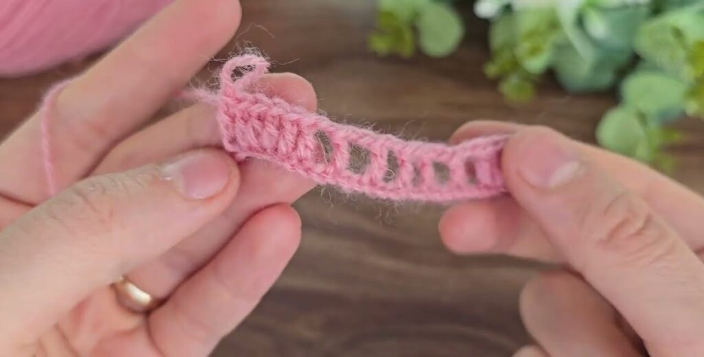 - Ch 1, skip 1 chain, 1 dc in next chain.