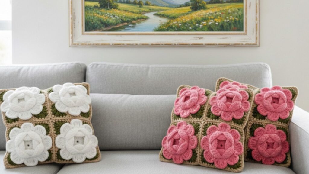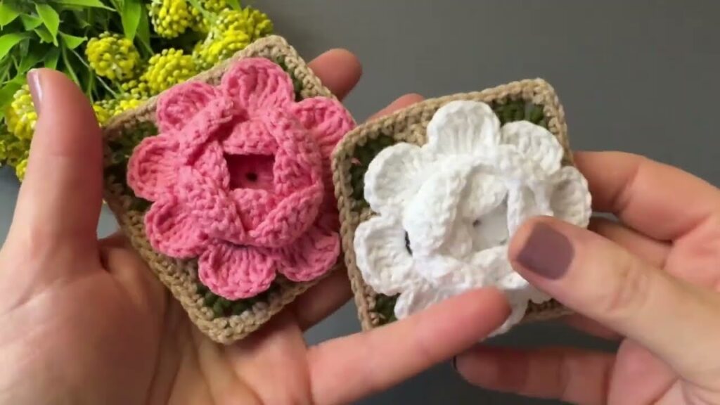 This is a 3D crochet flower granny square pillow 🌸