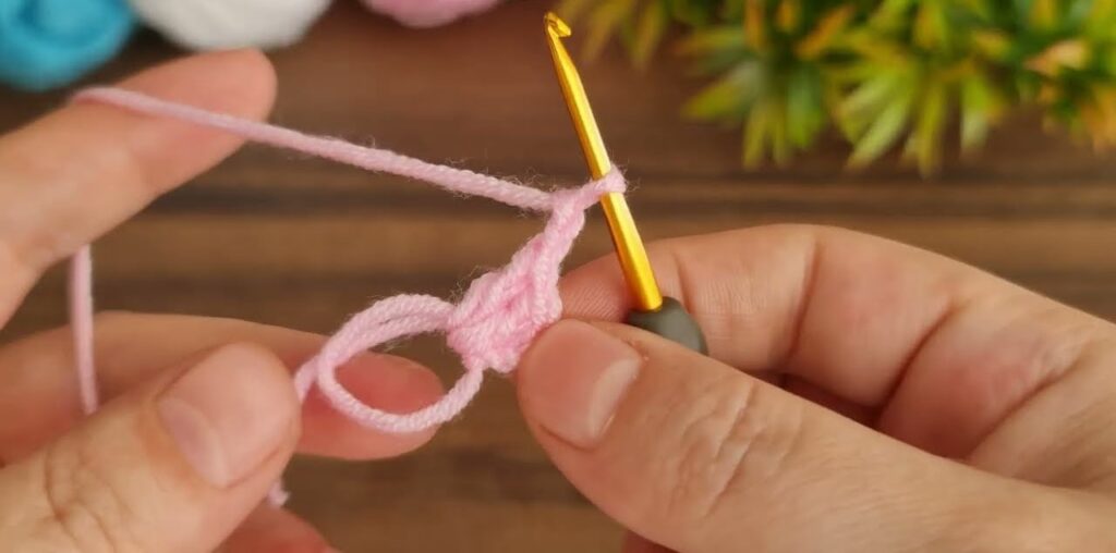 Insert hook in the top corner of the blue triangle and attach pink yarn.