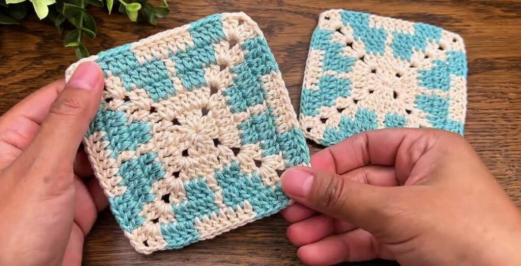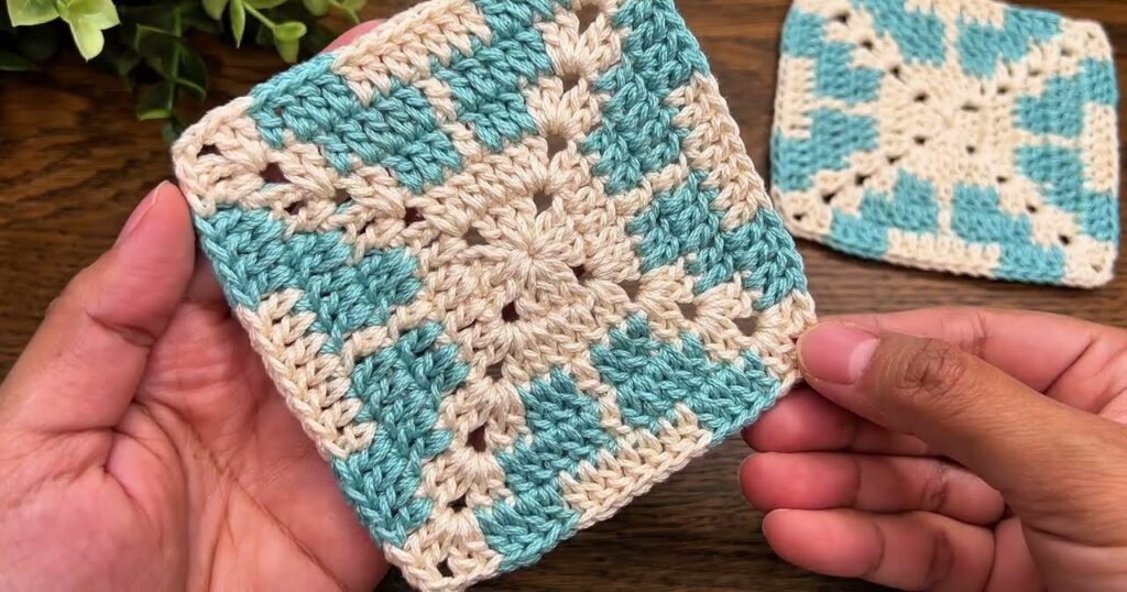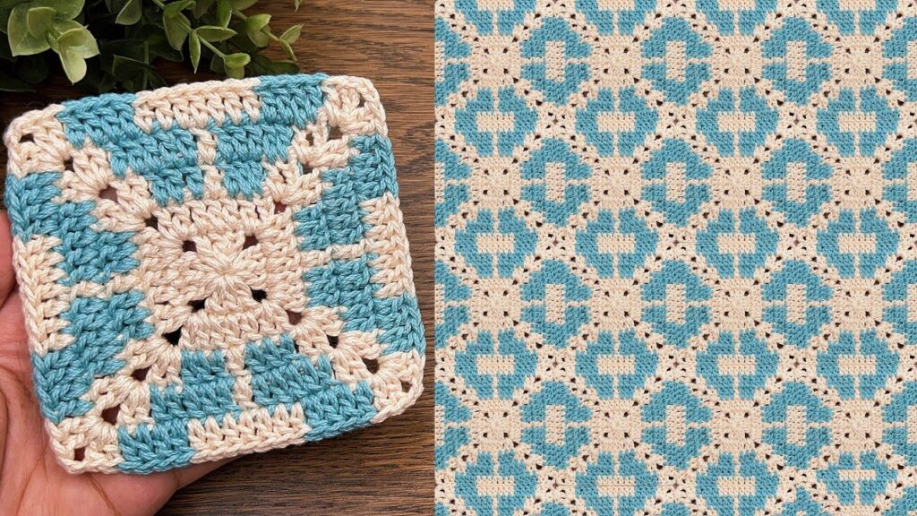 The image shows a crochet granny square pattern (on the left) and a joined blanket layout (on the right) made from those squares. It uses two colors — beige and turquoise — arranged in a geometric, mosaic-like design.