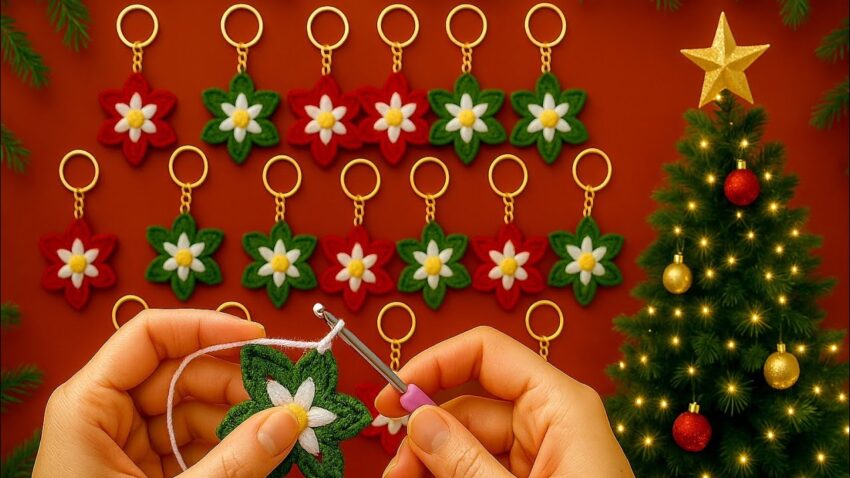 That’s a beautiful Christmas crochet keychain — shaped like a star flower with layers of green, white, and yellow yarn (and sometimes red). Here’s a detailed tutorial on how to make it step-by-step: