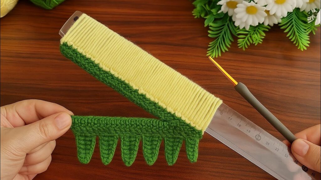 Here is how to make the crochet leaf-edge strip shown in the picture. This project uses a ruler (or any flat object) wrapped with yarn, then crocheted into to create the long loops and pointed leaves.