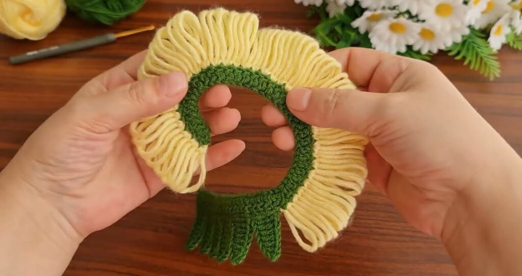 When finished, all yellow loops at the bottom are captured by a row of green single crochet.