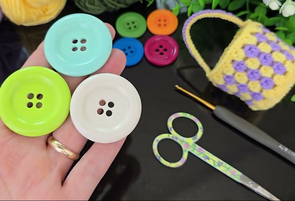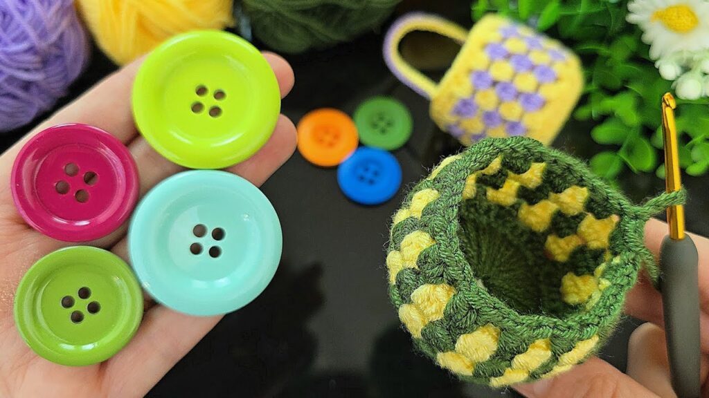 This is a crochet mini basket made around a 4-hole button, with yellow puff stitches and green structure.