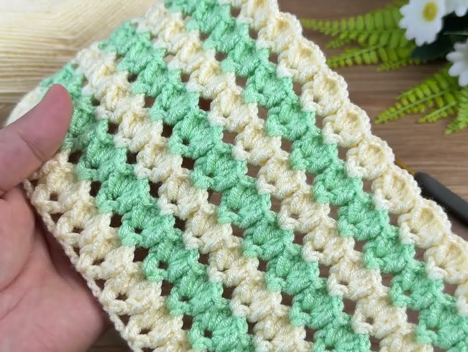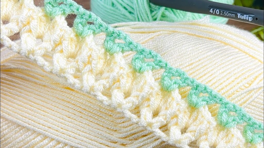 That crochet pattern in your image looks like a two-tone shell or cluster stitch border, made with soft yellow and mint green yarn. It uses basic crochet stitches — mostly chains, double crochets, and shell-like clusters.
