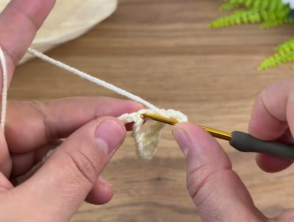 (The skipped 3 chains count as your first dc.) - Skip 1 chain, then make 2 dc in the next chain — this is your small “shell.”