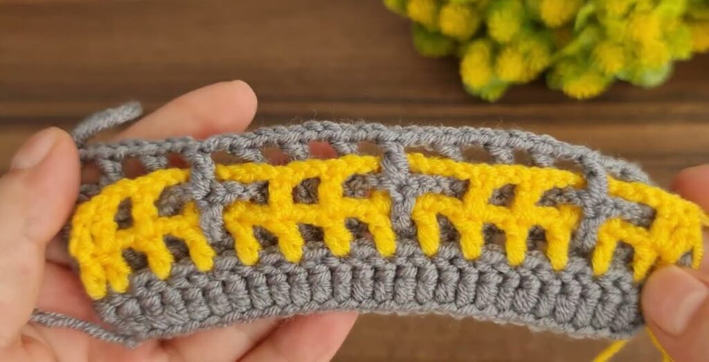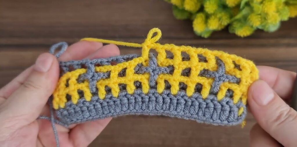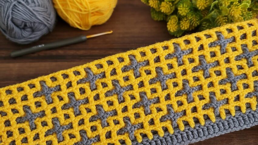 That crochet pattern is called the Cross Stitch Mosaic Crochet Pattern (sometimes also known as “X-Stitch Mosaic”). It combines two contrasting colors to create a woven or lattice look, as seen with the yellow and gray yarn in your image.