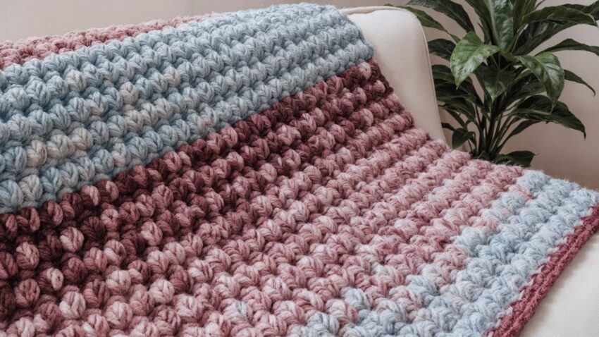 That’s a beautiful chunky puff stitch crochet blanket! 🧶