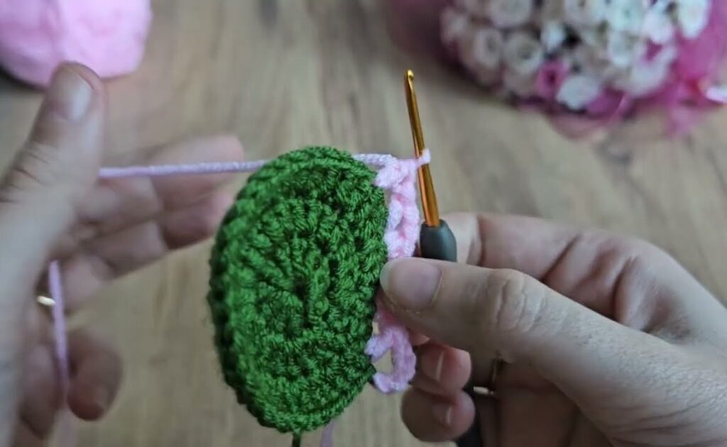 1. Attach pink yarn in any stitch with a slip knot.
