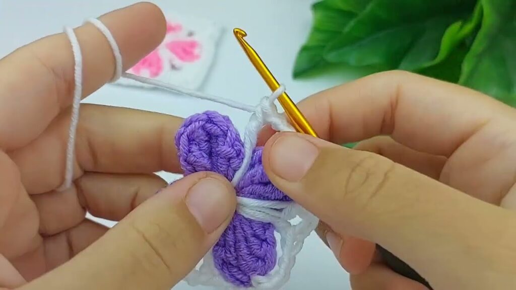 - Pick up the dropped loop and pull through β This closes the petal like a folded puff.