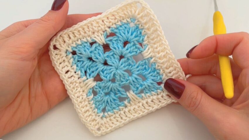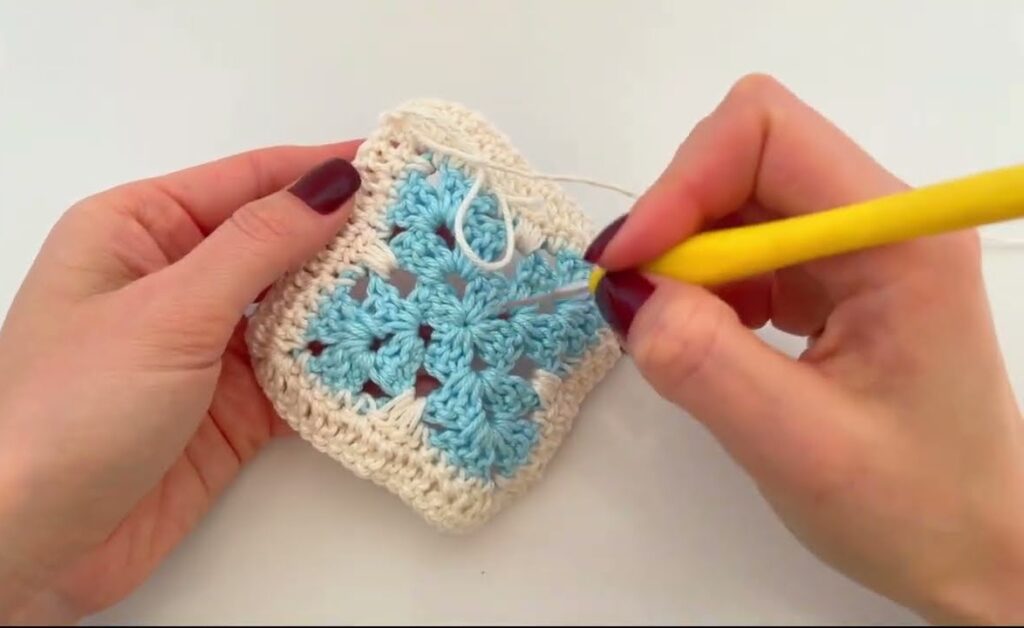 Here is a step-by-step tutorial so you can follow each stitch exactly to make the same square as your photo. 💙🤍