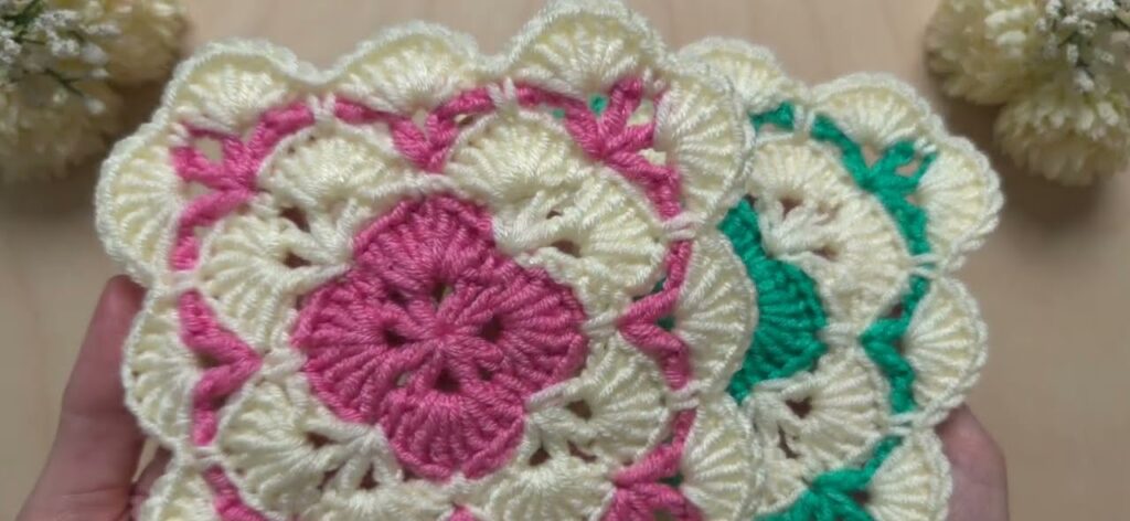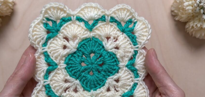 That’s a beautiful crochet square motif! It looks like a textured floral granny square, made with a combination of double crochet, puff stitches, and chain spaces. The photo shows two colors (teal and cream) arranged in petal-like rounds.