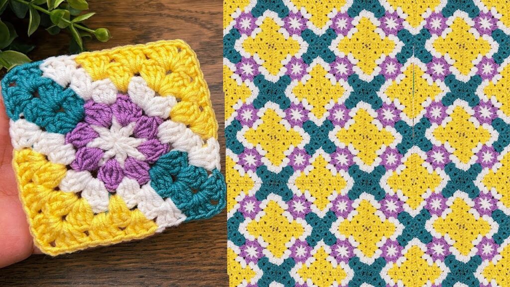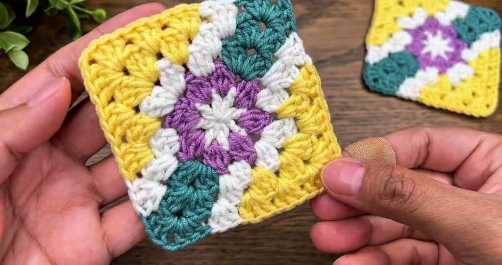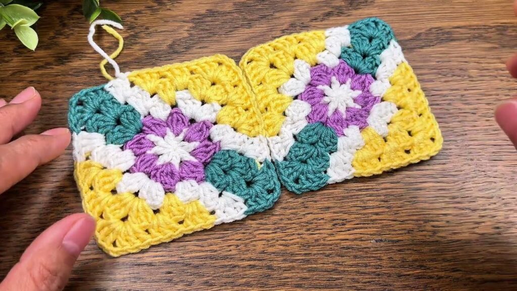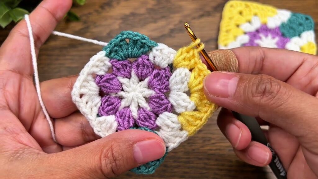 - Next corner space: 3 dc, ch 2, 3 dc.