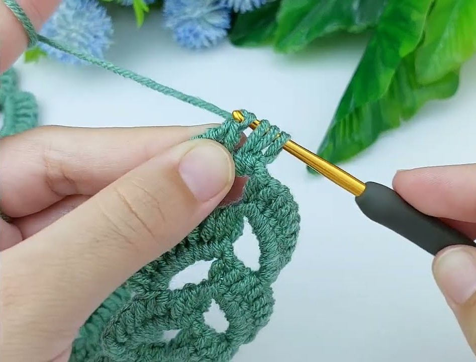 - Work 1 single crochet in each chain space between leaves
