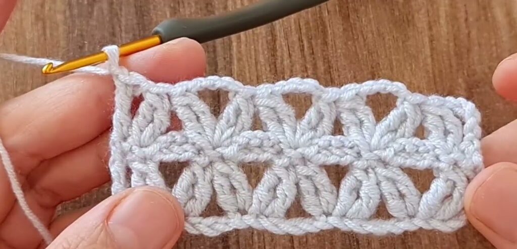 This stitch is made from long chains that cross and are locked in the middle, forming leaf-shaped ovals.