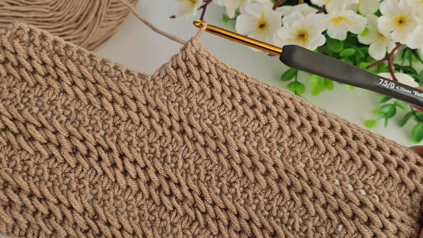 This is a Tunisian crochet stitch pattern, often called the Tunisian Simple Stitch (TSS). It uses a Tunisian crochet hook (shown in the image) — longer than regular hooks — and it creates a fabric that looks like a mix between crochet and knitting.