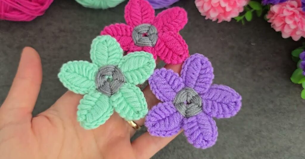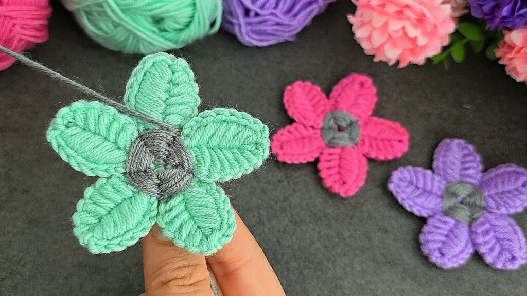 - Done! You now have a soft 3D yarn flower. 🌸