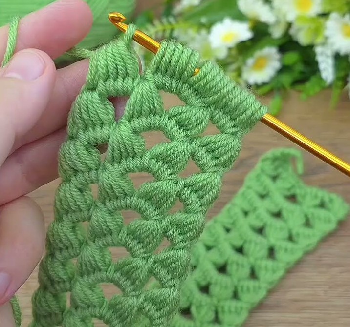 This crochet pattern in your image is called the “Broomstick Lace Stitch” (also known as Hairpin Lace or Broomstick Crochet). It’s a lacy and elegant stitch that uses a large knitting needle or broomstick and a crochet hook together to create those loops and clusters.