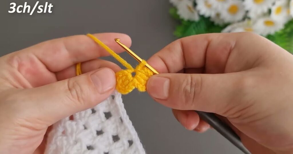 - When you reach the beginning, slip stitch into the first flowerโs base to join.