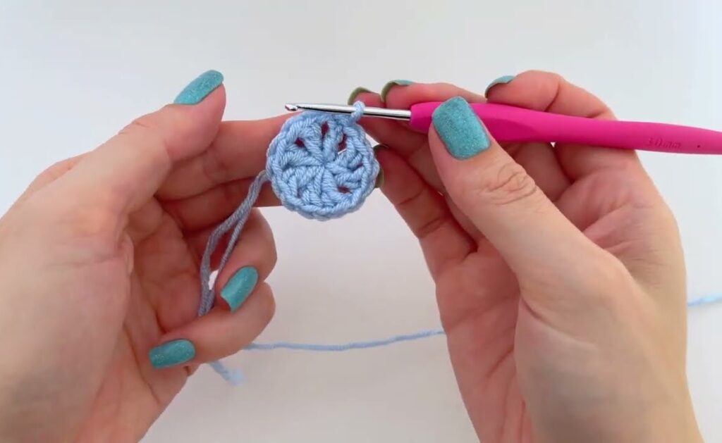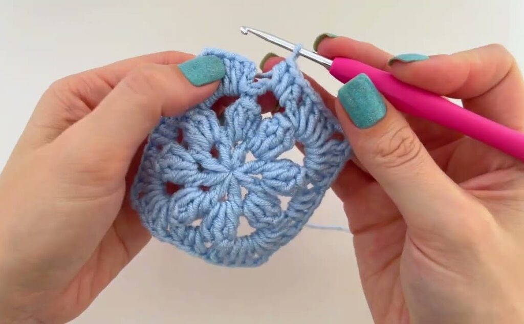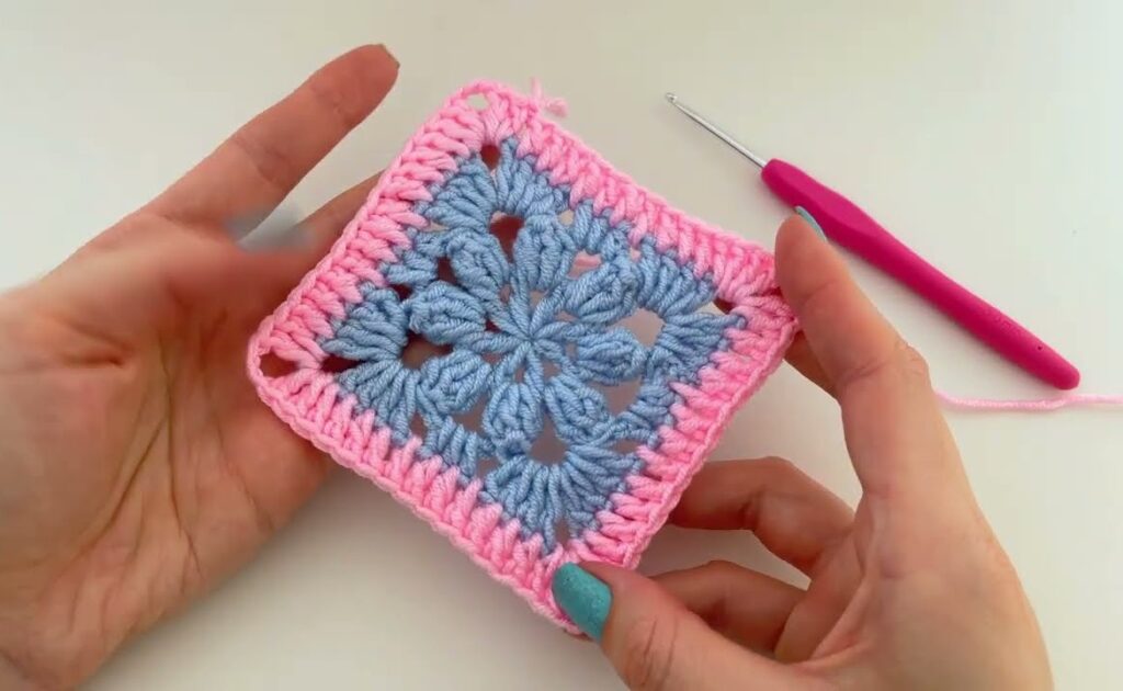Here is a step-by-step tutorial to make the flower granny square shown in your image (blue flower center + pink border). This uses puff-style petals and a simple DC border.