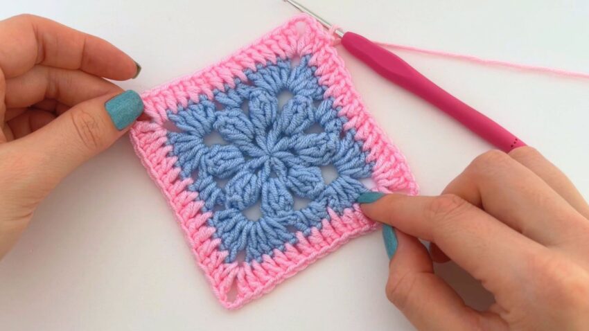 Here is a step-by-step tutorial to make the flower granny square shown in your image (blue flower center + pink border). This uses puff-style petals and a simple DC border.
