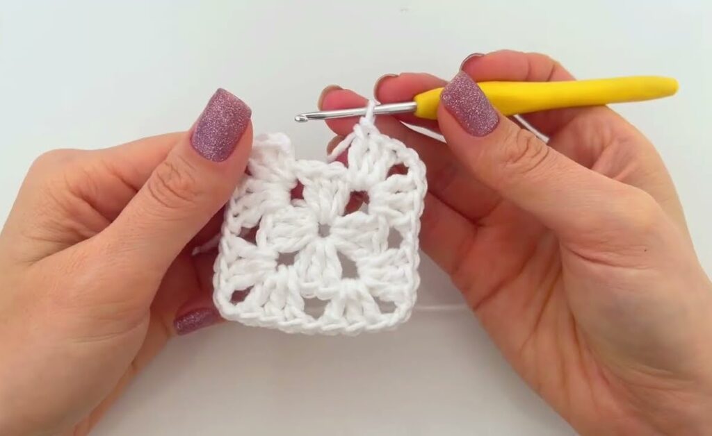 - Make (3 dc, chain 2, 3 dc) all in the same space → that’s the next corner.