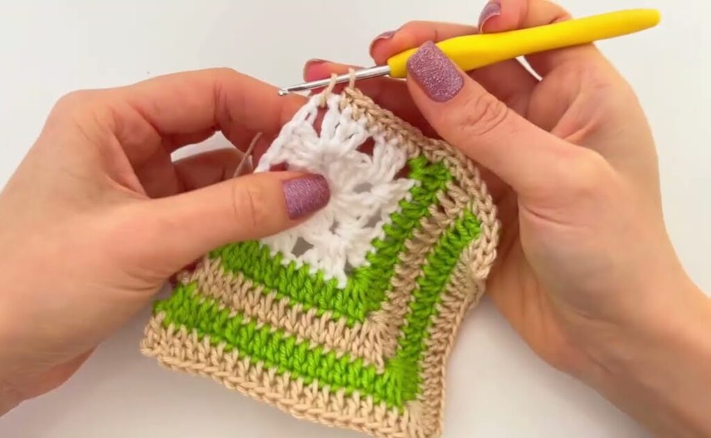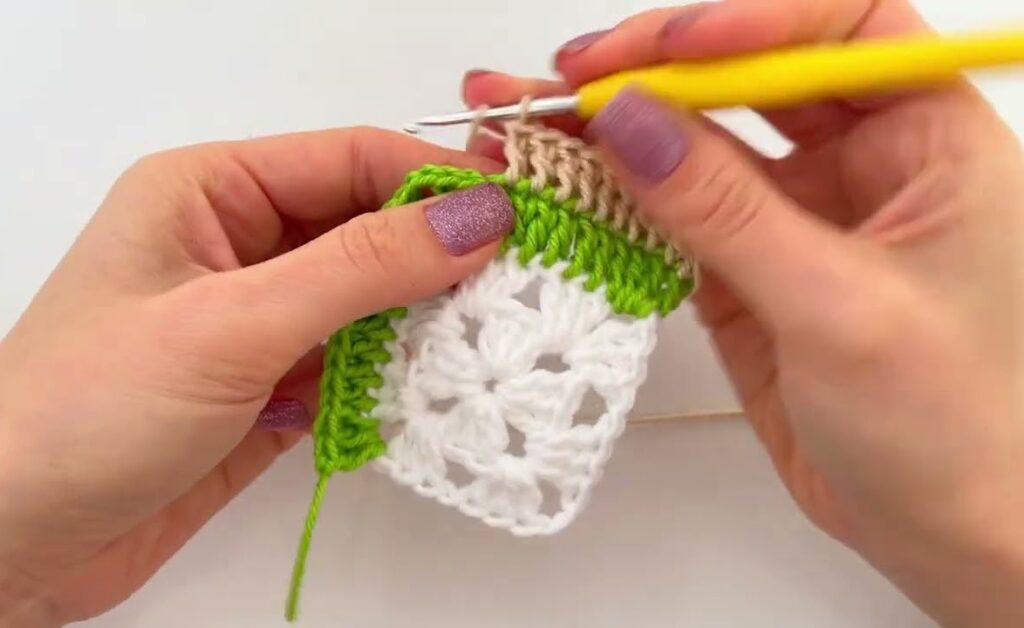 We’ll make exactly what’s in your photo: a two-color granny square, starting with white in the center and adding a green border.