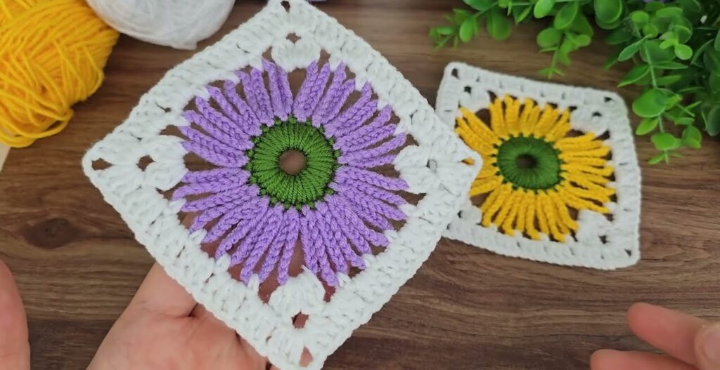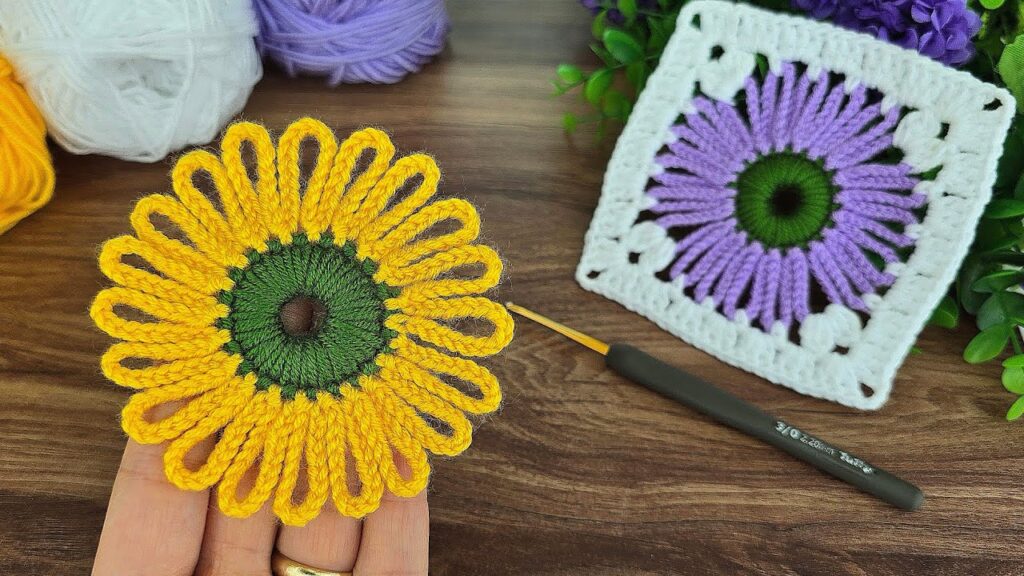 That’s a crochet daisy (or sunflower) granny square pattern — it has long loop petals and a tightly stitched center. 🌻