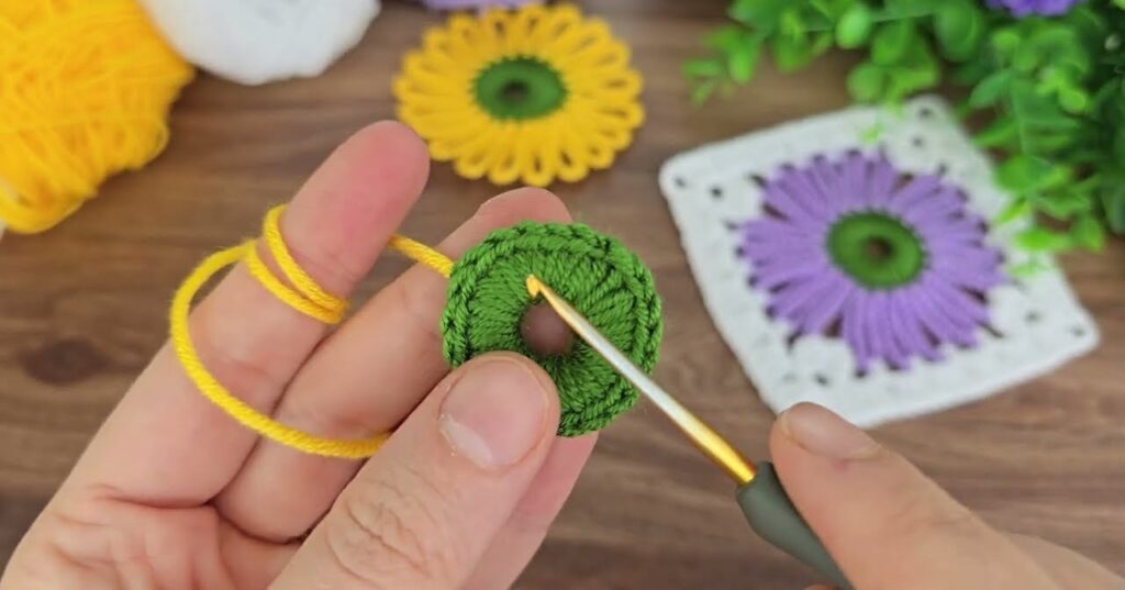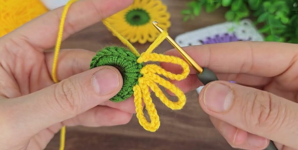 - Turn your work to the back (optional) or stay on the front depending on how you like the look. With the petal color still on the hook, work 1 sc in each green stitch around the base (12 sc if you used 12 green stitches, but because we made 16 loops we spaced them across the green — if you used 12 green stitches and made 16 loops you’ll need to space them, so the tidy round is “sc into the st or between st where loops are anchored” — the goal: 1 sc at each loop base). Count carefully: you should have 16 sc around the loop bases (one sc under each loop). Join with sl st, fasten off or carry yarn.