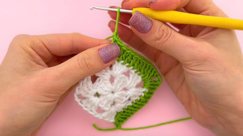 We’ll make exactly what’s in your photo: a two-color granny square, starting with white in the center and adding a green border.