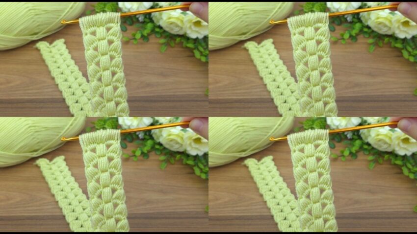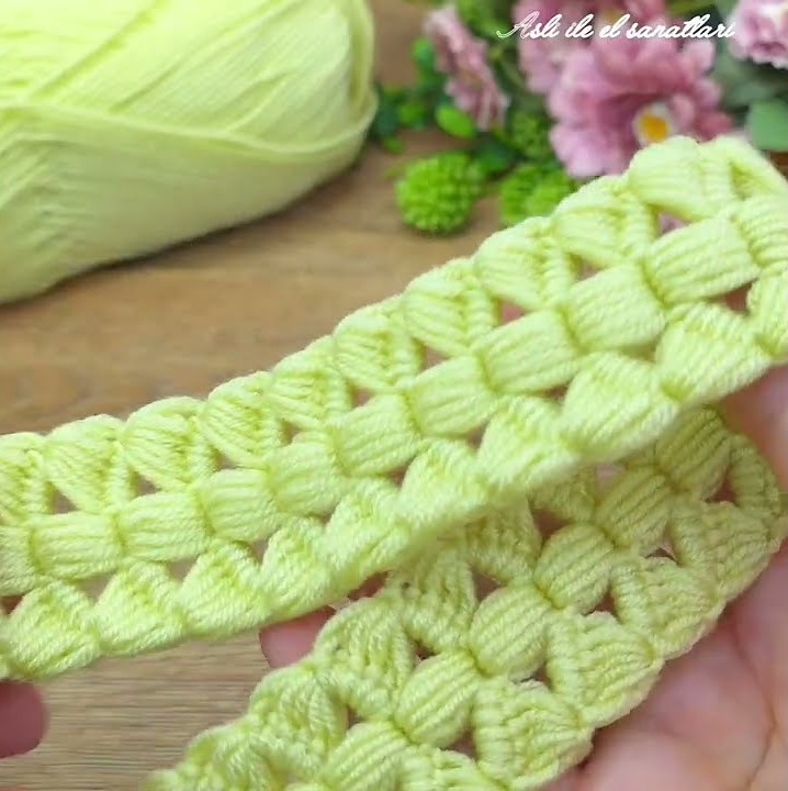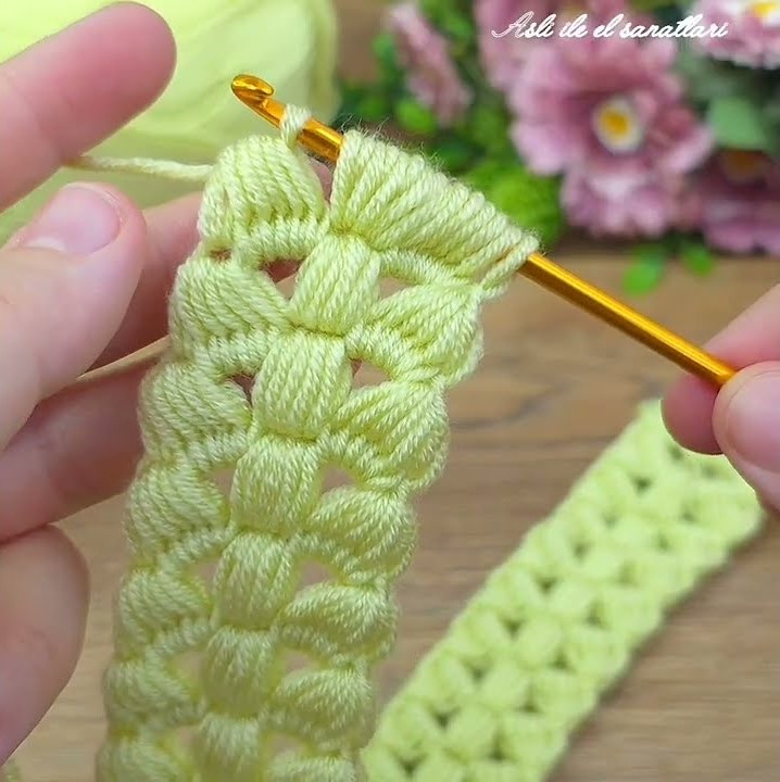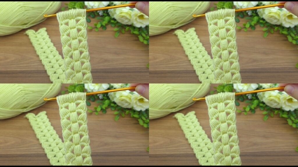 This pattern creates a raised, vertical puff texture — great for borders, straps, scarves, or decorative bands.